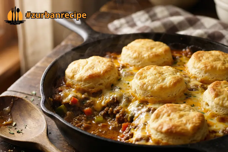 A warm, comforting skillet made with seasoned beef, soft vegetables, a creamy cheesy sauce, and golden biscuits baked right on top. It’s a modern twist on classic comfort food, perfect for family dinners or cozy nights.