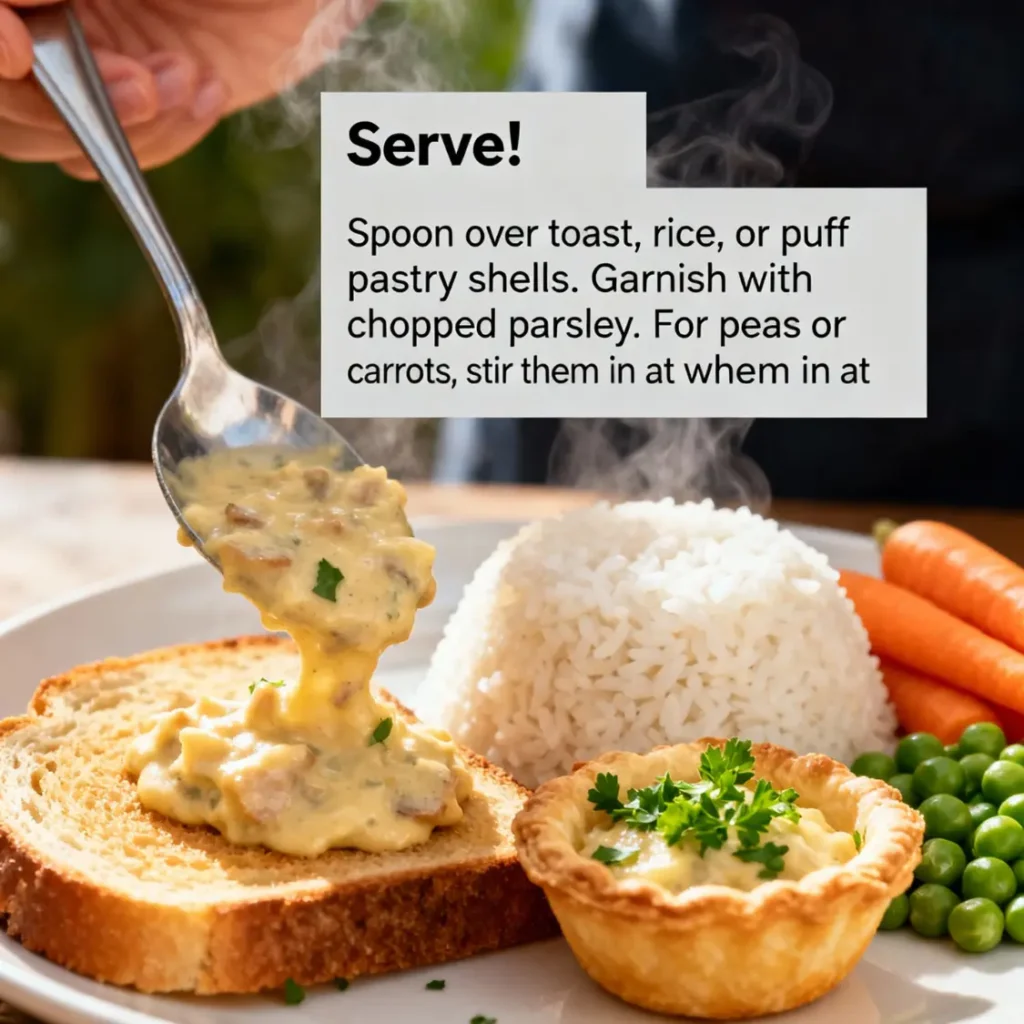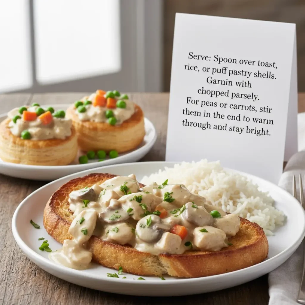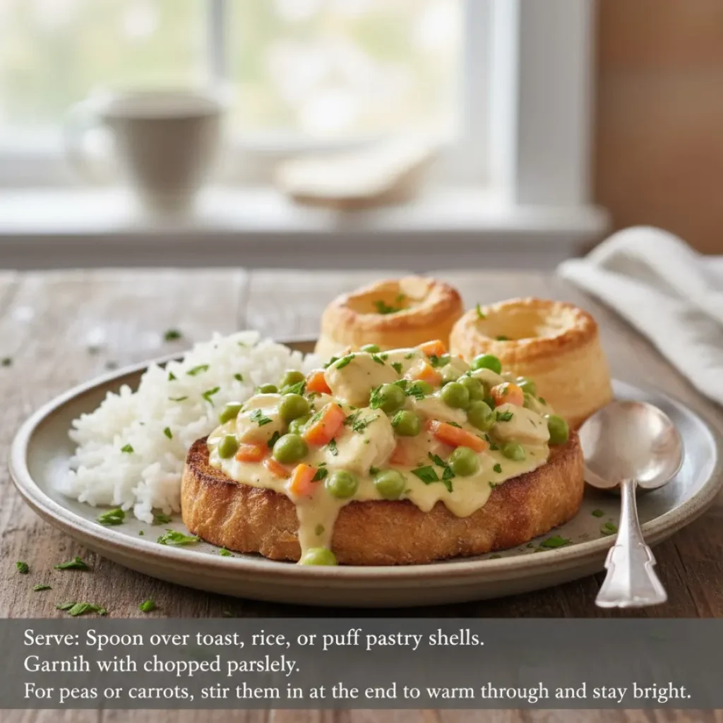 For a lighter, low-carb alternative, replace the flour with 1 tablespoon of almond flour or coconut flour to thicken the sauce. Skip the toast or pastry and instead serve the creamy chicken over steamed vegetables like cauliflower, zucchini noodles, or sautéed spinach. The dish keeps its richness while being keto-friendly.