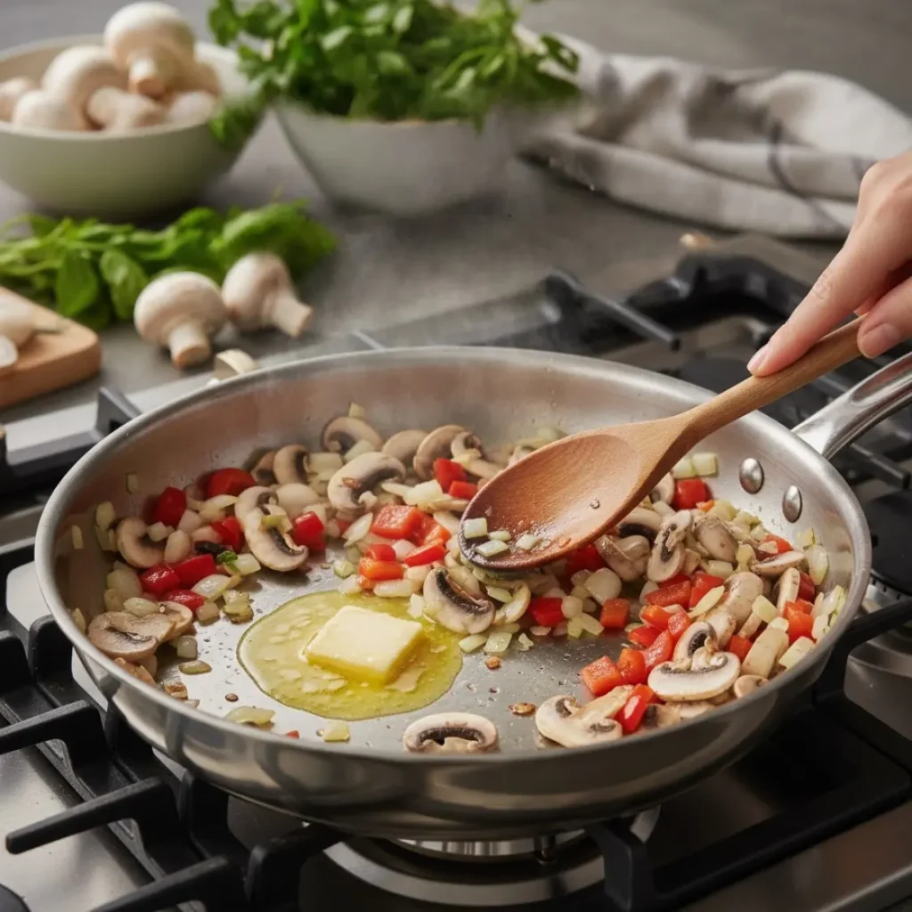Step 1: Sauté onions, mushrooms, and peppers in butter.