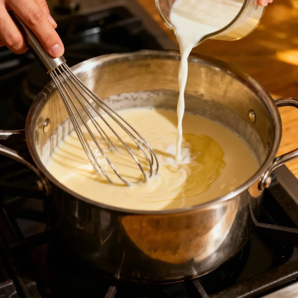 Pour the liquids slowly. Add the chicken broth in a thin stream, then the milk, whisking as you go to keep the sauce silky and lump-free.