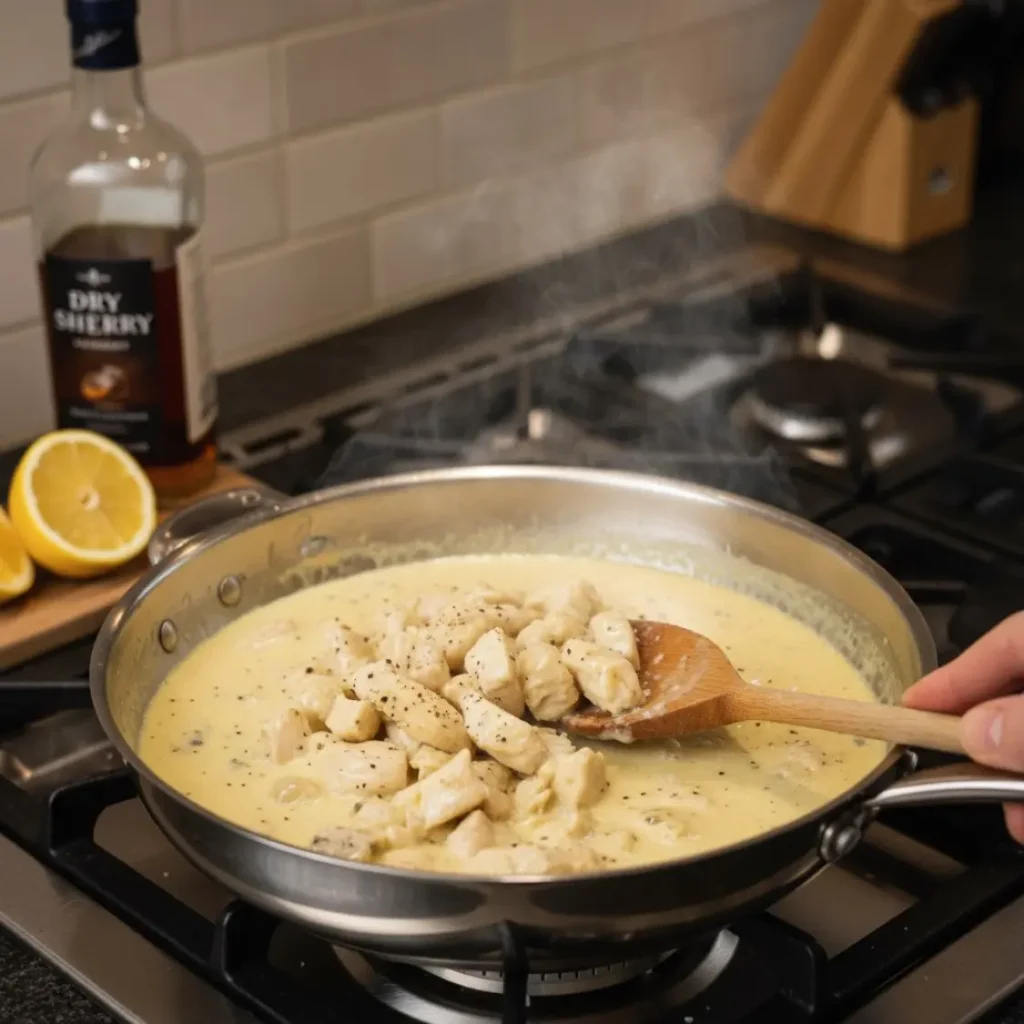 Fold in the diced cooked chicken, salt, pepper, and the optional lemon juice or dry sherry. Simmer on low 5 to 7 minutes, stirring occasionally, until hot and creamy.