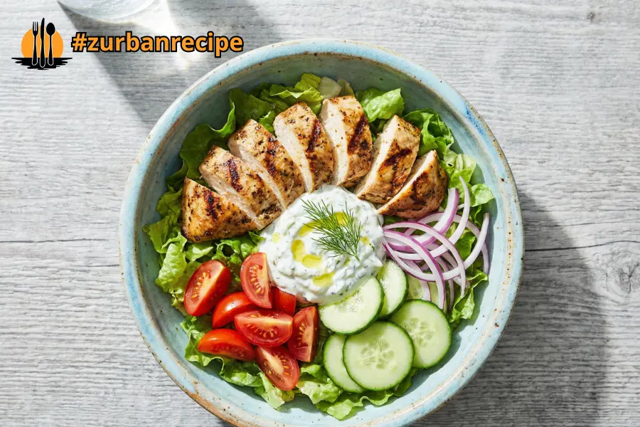 - Assemble bowls with romaine, cucumber, tomatoes, red onion, feta, and sliced chicken.
