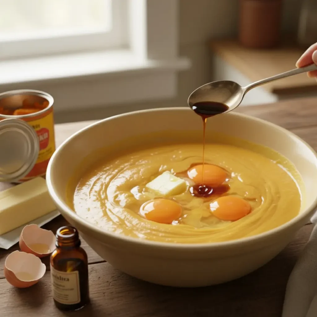 In another bowl, combine pumpkin purée with melted butter, eggs, and vanilla. The batter turns rich and golden, smooth enough to promise something special.