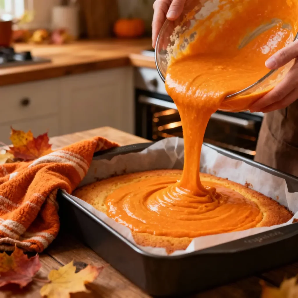 Now gently bring the dry and wet ingredients together. Don’t rush this step, fold the mixture like a blanket, slow and gentle. Pour the glowing orange batter into your pan and let the oven transform it into pure autumn comfort.