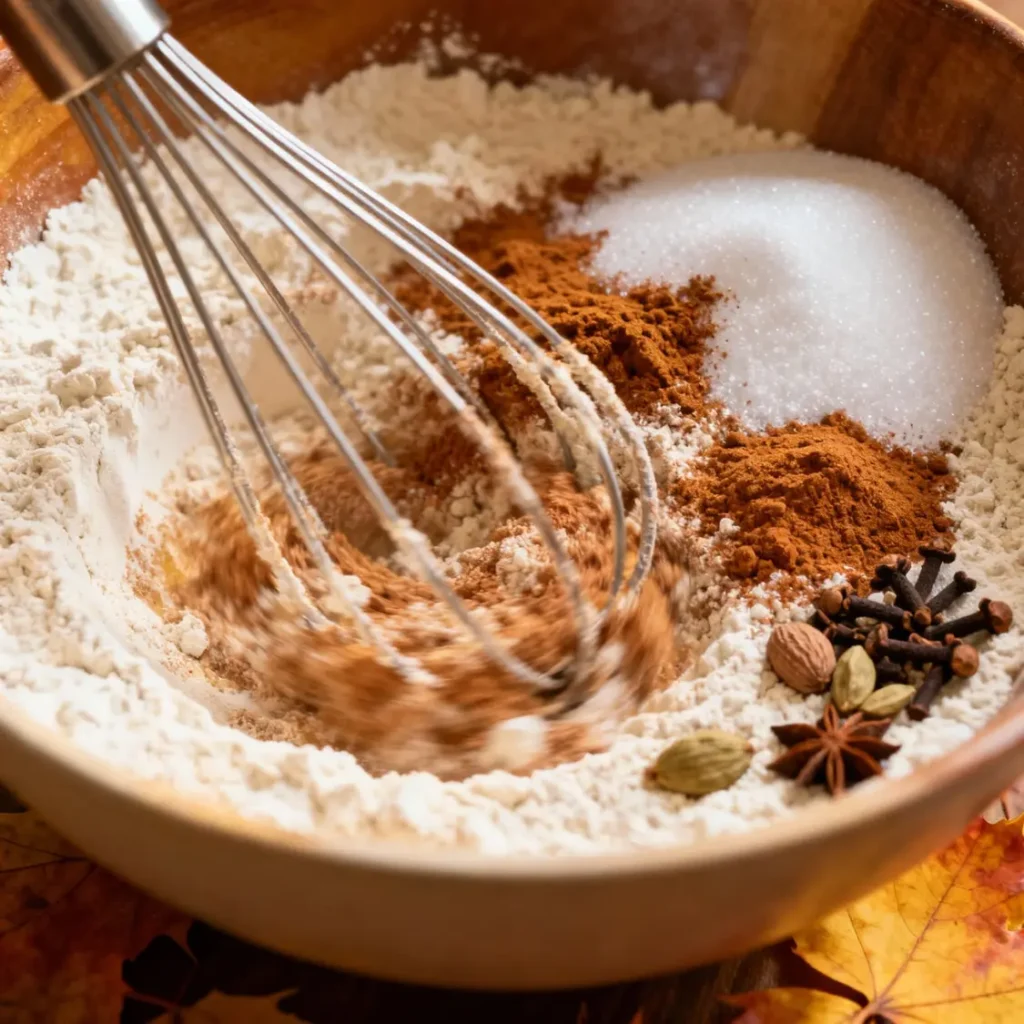 Start by whisking together the flour, sugar, and all those warming spices: cinnamon, nutmeg, and cloves. The aroma alone will remind you of crisp fall mornings.