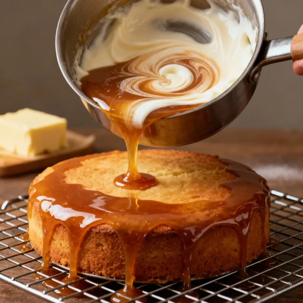 While the cake cools, it’s time for the caramel drizzle. Sugar melts into amber, cream swirls in, and butter turns it all into silk. When it’s ready, pour the warm caramel slowly over the cake, letting it find every curve and corner until the top gleams.