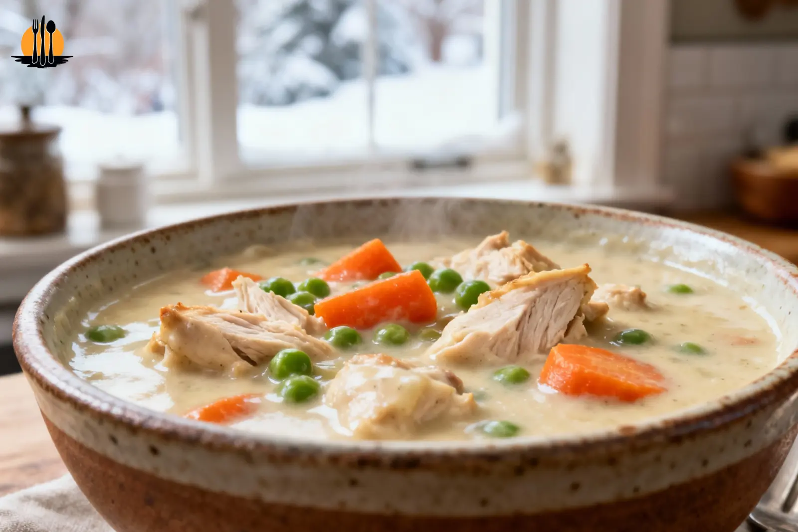 A slow-cooked chicken pot pie stew with tender vegetables and a creamy sauce that tastes like home after a long day.